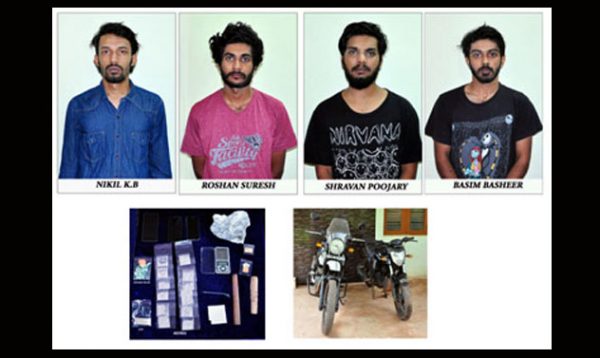 ಬಂಧಿತ ಆರೋಪಿಗಳನ್ನು ಕಾಸರಗೋಡು ಕಾಞಿಂಗಾಡ್ ರೈಲ್ವೆ ನಿಲ್ದಾಣ ಬಳಿಯ ನಿಖಿಲ್.ಕೆ.ಬಿ (24), ಕುಲಶೇಖರದ ಶ್ರವಣ ಪೂಜಾರಿ (23), ಕೇರಳ ಕಣ್ಣೂರಿನ ರೋಶನ್ ವೇಗಸ್ (22) ಮತ್ತು ಕೇರಳ ತ್ರಿಶೂರಿನ ಬಾಶಿಂ ಬಶೀರ್ (22) ಎಂದು ಗುರುತಿಸಲಾಗಿದೆ.