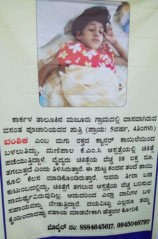 ಉಡುಪಿ: ಕಾರ್ಕಳದ ಮಜೂರಿನ 5 ವರುಷದ ಪುಟ್ಟ ಬಾಲಕಿ ವಂಶಿಕ ರಕ್ತ ಕ್ಯಾನ್ಸರ್ ನಿಂದ ಬಳಲುತ್ತಿದ್ದು ಮಣಿಪಾಲದ ಕೆ ಎಂ ಸಿ ಆಸ್ಪತ್ರೆಯಲ್ಲಿ ಚಿಕಿತ್ಸೆ ಪಡೆಯುತ್ತಿದ್ದಾಳೆ. ಬಡ ಕುಟುಂಬವಾದ ಕಾರಣ ಈಕೆಯ ಚಿಕಿತ್ಸೆಗೆ ತಗಲುವ ಹತ್ತು ಲಕ್ಷ ರೂಪಾಯಿ ಹೊಂದಿಸಲು ಈಕೆಯ ತಂದೆ ತಾಯಿಗೆ ಸಾಧ್ಯವಾಗುತ್ತಿಲ್ಲ. ಸುಮಾರು ಹತ್ತು ಲಕ್ಷ ರೂಪಾಯಿಗಳು ಚಿಕಿತ್ಸಾ ವೆಚ್ಚಕ್ಕೆ ಬೇಕಾಗಿದ್ದು ,ದಾನಿಗಳ ಸಹಾಯ ಹಸ್ತಕ್ಕೆ ಹೆತ್ತವರು ಕೈ ಚಾಚಿದ್ದಾರೆ.