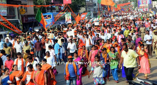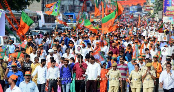 ಮಂಗಳೂರು, ಮಾರ್ಚ್.6: ಬಿಜೆಪಿ ರಾಜ್ಯ ಘಟಕ ಹಮ್ಮಿಕೊಂಡಿರುವ ‘ಮಂಗಳೂರು ಚಲೋ-ಜನಸುರಕ್ಷಾ ಯಾತ್ರೆ’ ಇಂದು ನಗರದ ಕೇಂದ್ರ ಮೈದಾನದಲ್ಲಿ ಸಮಾಪನಗೊಳ್ಳಲಿರುವ ಹಿನ್ನೆಲೆಯಲ್ಲಿ ಮಂಗಳೂರಿಗೆ ಆಗಮಿಸಿದ್ದು, ನಗರದ ಅಂಬೇಡ್ಕರ್ ವೃತ್ತದಿಂದ ಸಾಗಿಬಂದ ಯಾತ್ರೆಯಲ್ಲಿ ಸಂಸದರಾದ ನಳೀನ್ ಕುಮಾರ್ ಕಟೀಲ್, ಶೋಭಾ ಕರಂದ್ಲಾಜೆ,ಪ್ರತಾಪ್ ಸಿಂಹ, ಅನಂತ್ಕುಮಾರ್ ಹೆಗಡೆ ಜಿಲ್ಲಾ ಬಿಜೆಪಿ ಅಧ್ಯಕ್ಷ ಸಂಜೀವ ಮಟಂದೂರು ಸಹಿತಾ ಸಾವಿರಾರು ಮಂದಿ ಕಾರ್ಯಕರ್ತರು ಭಾಗವಹಿಸಿದ್ದರು.