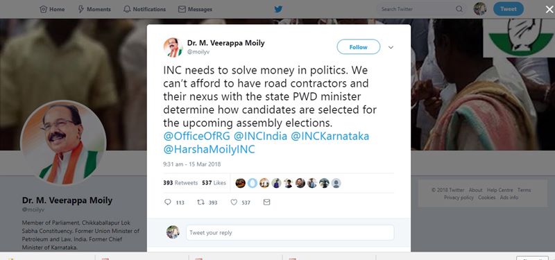 ಗುರುವಾರ ರಾತ್ರಿ ಟ್ವೀಟ್ ಮೊಯ್ಲಿ ಖಾತೆಯಿಂದ ಟ್ವೀಟ್ ಮಾಡಲಾಗಿದ್ದು, ‘ರಾಜಕೀಯದಲ್ಲಿನ ಹಣದ ಸಮಸ್ಯೆಯನ್ನು ಕಾಂಗ್ರೆಸ್ ಬಗೆಹರಿಸಿ ಕೊಳ್ಳಬೇಕಿದೆ. ರಸ್ತೆ ಗುತ್ತಿಗೆದಾರರು ಹಾಗೂ ರಾಜ್ಯ ಲೋಕೋಪಯೋಗಿ ಸಚಿವರ ಜೊತೆ ಅವರು ಹೊಂದಿರುವ ನಂಟು ಮುಂದಿನ ವಿಧಾನಸಭೆ ಚುನಾವಣೆಗೆ ಅಭ್ಯರ್ಥಿಗಳನ್ನು ಹೇಗೆ ಆಯ್ಕೆ ಮಾಡಬೇಕು ಎಂಬುದನ್ನು ನಿರ್ಧರಿಸುವುದು ದುಬಾರಿಯಾದೀತು’ ಎಂದು ಹೇಳಲಾಗಿತ್ತು. ಇದೇ ರೀತಿಯ ಟ್ವೀಟ್ ಒಂದನ್ನು ಮೊಯ್ಲಿ ಅವರ ಪುತ್ರ, ಉದ್ಯಮಿ ಹರ್ಷ ಮೊಯ್ಲಿ ಖಾತೆಯಿಂದಲೂ ಮಾಡಿದ್ದಾರೆ.
