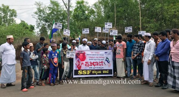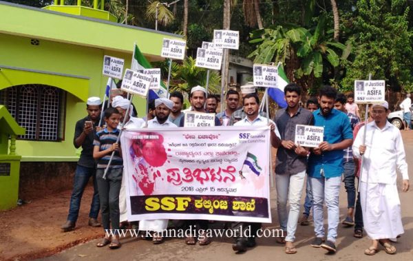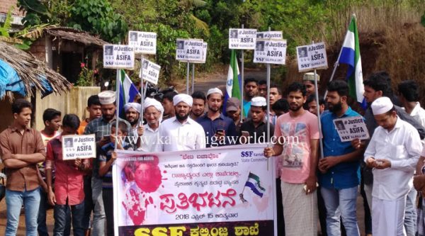 ಮಂಗಳೂರು / ಕಲ್ಮಿಂಜ: ಜಮ್ಮು ಕಾಶ್ಮೀರದ ಕಥುವಾ ಜಿಲ್ಲೆಯ 8ರ ಹರೆಯದ ಬಾಲಕಿ ಆಸಿಫಾ ಅತ್ಯಾಚಾರ ಮತ್ತು ಬರ್ಬರ ಕೊಲೆಯನ್ನು ಖಂಡಿಸಿ ಆರೋಪಿಗಳಿಗೆ ಕಠಿಣ ಶಿಕ್ಷೆಗೆ ಹಾಗೂ ಕುಟುಂಬಕ್ಕೆ ನ್ಯಾಯ ಒದಗಿಸುವಂತೆ ಎಸ್.ಎಸ್.ಎಫ್ ಕಲ್ಮಿಂಜ ಯುನಿಟ್ ಇದರ ವತಿಯಿಂದ ಕಲ್ಮಿಂಜ ಜಂಕ್ಷನ್ ನಲ್ಲಿ ಪ್ರತಿಭಟನೆ ನಡೆಯಿತು.
