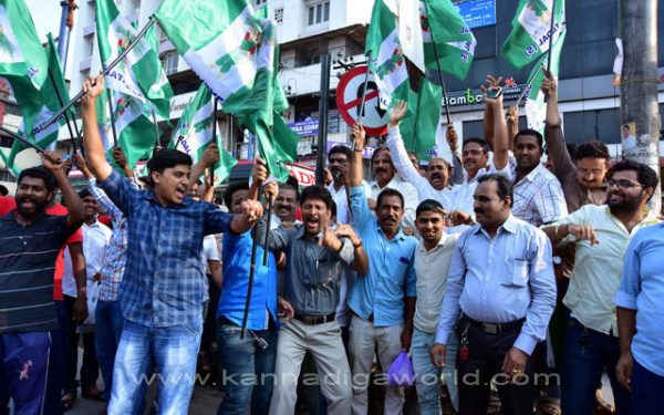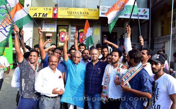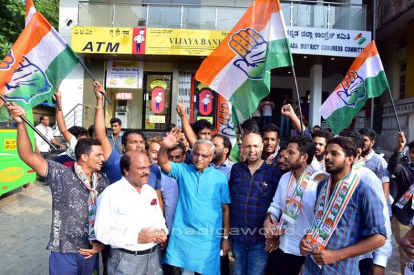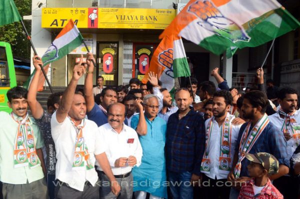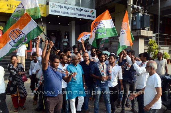 ಬಿ.ಎಸ್ ಯಡಿಯೂರಪ್ಪ ಅವರು ರಾಜೀನಾಮೆ ನೀಡಿದ ಹಿನ್ನೆಲೆಯಲ್ಲಿ ಸೋಮವಾರ ಕಾಂಗ್ರೆಸ್ ಹಾಗೂ ಜೆಡಿಎಸ್ ಸಮಿಶ್ರ ಸರಕಾರ ನಡೆಸುವುದಾಗಿ ಘೋಷಣೆ ಮಾಡಿದ ಹಿನ್ನಲೆಯಲ್ಲಿ ಕಾಂಗ್ರೆಸ್ ಹಾಗೂ ಜೆಡಿಎಸ್ನ ಶಾಸಕರು, ಪದಾಧಿಕಾರಿಗಳು ಹಾಗೂ ಕಾರ್ಯಕರ್ತರು ನಗರದ ಮಲ್ಲಿಕಟ್ಟೆಯಲ್ಲಿರುವ ಕಾಂಗ್ರೆಸ್ ಕಚೇರಿ ಮುಂಬಾ ಪಟಾಕಿ ಸಿಡಿಸಿ, ಸಿಹಿತಿಂಡಿ ವಿತರಿಸಿ ಸಂಭ್ರಮ ಆಚರಿಸಿದರು.