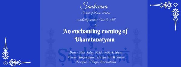 29-07-2018ರ ಸಂಜೆ ಉಡುಪಿಯಲ್ಲಿ ಜರುಗುವ ಭಕ್ತಿ ಭಾವ ಪೂರ್ಣ ಶಾಸ್ತ್ರೀಯ ನೃತ್ಯ ಕಾರ್ಯಕ್ರಮಕ್ಕೆ ಎಲ್ಲಾ ಕಲಾ ಪ್ರಿಯರಿಗೆ ಸಂಕೀರ್ಣ ನೃತ್ಯ ಶಾಲೆ ದುಬೈಯ ಗುರು ,ಶಿಷ್ಯವೃಂದ ಹಾಗು ಪೋಷಕವರ್ಗದವರ ಸವಿನಯ ಆಮಂತ್ರಣ.
