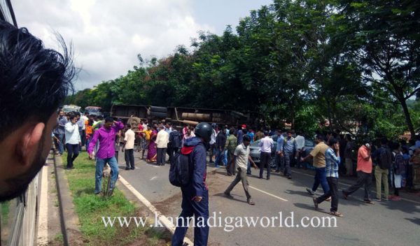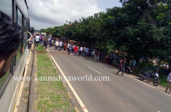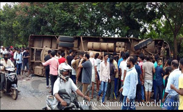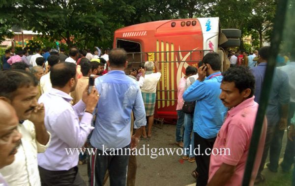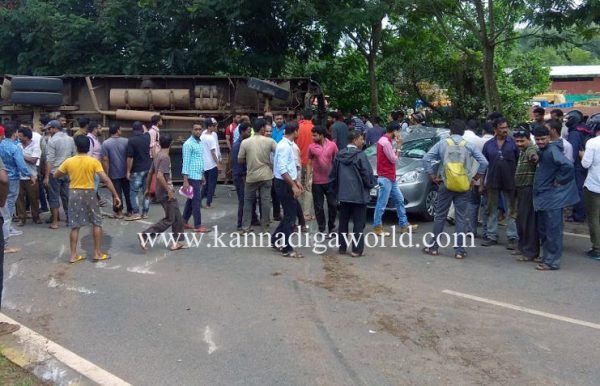 ಚಲಿಸುತ್ತಿದ್ದ ಬಸ್ಸಿನ ಟಯರ್ ಸಿಡಿದ ಪರಿಣಾಮ ಬಸ್ಸು ಕಾರಿಗೆ ಢಿಕ್ಕಿ ಹೊಡೆದು ಮಗುಚಿಬಿದಿದೆ. ಅಪಘಾತದಿಂದ ಕಾರು ಸಂಪೂರ್ಣವಾಗಿ ನಜ್ಜು ಗುಜ್ಜಾಗಿದ್ದು, ಬಸ್ ಕೂಡಾ ಜಖಂಗೊಂಡಿದೆ. ಘಟನೆಯಲ್ಲಿ ಕಾರಿನಲ್ಲಿದ್ದ ಮೂವರು ಗಂಭೀರ ಗಾಯಗೊಂಡಿದ್ದಾರೆ. ಬಸ್ಸಿನಲ್ಲಿದ್ದ ಪ್ರಯಾಣಿಕರ ಪೈಕಿ ಹಲವರಿಗೆ ಗಾಯಗಳಾಗಿವೆ. ಗಾಯಾಳುಗಳನ್ನು ಸ್ಥಳೀಯ ಹಾಗೂ ಮಂಗಳೂರಿನ ವಿವಿಧ ಆಸ್ಪತ್ರೆಗಳಿಗೆ ದಾಖಲಿಸಲಾಗಿದೆ.