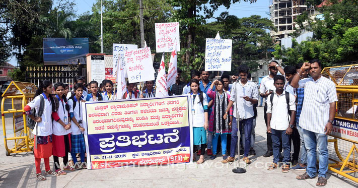 ಪ್ರತಿಭಟನಾಕಾರರನ್ನುದ್ದೇಶಿಸಿ, SFI ಜಿಲ್ಲಾಧ್ಯಕ್ಷರೂ, ವಕೀಲರಾದ ಚರಣ್ ಶೆಟ್ಟಿ,ಜಿಲ್ಲಾ ಕಾರ್ಯದರ್ಶಿ ಮಾಧುರಿ ಬೋಳಾರ, ಮಾಜಿ ವಿಧ್ಯಾರ್ಥಿ ನಾಯಕರಾದ ಸುನಿಲ್ ಕುಮಾರ್ ಬಜಾಲ್, ವಿಧ್ಯಾರ್ಥಿ ನಾಯಕಿಯಾದ ರೇಷ್ಮಾರವರು ಮಾತನಾಡಿದರು.
