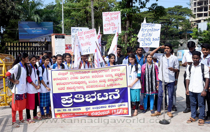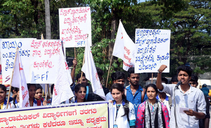 ಮಂಗಳೂರು : ವೆನ್ಲಾಕ್ ಪ್ಯಾರಾ ಮೆಡಿಕಲ್ ವಿದ್ಯಾರ್ಥಿಗಳಿಗೆ ತರಗತಿಗಳು ಪ್ರಾರಂಭವಾಗಿ ಎರಡು ತಿಂಗಳು ಕಳೆದರೂ ಕೂಡ ಪಠ್ಯ ಚಟುವಟಿಕೆಗಳು ಆರಂಭವಾಗಿಲ್ಲ.ಹಾಗಾಗಿ ಪಠ್ಯ ಚಟುವಟಿಕೆಗಳನ್ನು ಆರಂಭಿಸಲು, ಪೋಸ್ಟಿಂಗ್ ಹೆಸರಿನಲ್ಲಿ ನಿಯಮ ಮೀರಿ ಆಸ್ಪತ್ರೆಯ ಕೆಲಸಗಳಿಗೆ ವಿಧ್ಯಾರ್ಥಿಗಳನ್ನು ನಿಯೋಜಿಸುತ್ತಿರುವುದನ್ನು ವಿರೋಧಿಸಿ, ನುರಿತ ಉಪನ್ಯಾಸಕರನ್ನು ನೇಮಿಸಲು ಒತ್ತಾಯಿಸಿ ಭಾರತ ವಿದ್ಯಾರ್ಥಿ ಫೆಡರೇಶನ್ (SFI) ದಕ್ಷಿಣ ಕನ್ನಡ ಜಿಲ್ಲಾ ಸಮಿತಿ ನೇತೃತ್ವದಲ್ಲಿ ಬುಧವಾರ ಮಂಗಳೂರಿನ ಜಿಲ್ಲಾಧಿಕಾರಿಗಳ ಕಚೇರಿಯೆದುರು ಪ್ರತಿಭಟನಾ ಪ್ರದರ್ಶನ ಜರುಗಿತು.