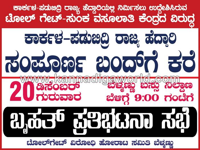 ಅಂದು ಬೆಳಿಗ್ಗೆ 9ಕ್ಕೆ ಬೆಳ್ಮಣ್ ಬಸ್ಸು ನಿಲ್ದಾಣದ ಬಳಿ ಬ್ರಹತ್ ಪ್ರತಿಭಟನಾ ಸಭೆ ನಡೆಯಲಿದ್ದು ಪಡುಬಿದ್ರಿಯಿಂದ ಕಾರ್ಕಳದವರೆಗಿನ ಹೆದ್ದಾರಿಯ ಎಲ್ಲಾ ಅಂಗಡಿ ಮುಂಗಟ್ಟುಗಳನ್ನು ಮುಚ್ಚಿ ಸಹಕರಿಸುವುದರ ಜತೆ ಉದ್ಯಮಿಗಳು ಹಾಗೂ ನಾಗರಿಕರು ಸಂಪೂರ್ಣ ಬೆಂಬಲ ನೀಡಬೇಕು ಎಂದು ಟೋಲ್ಗೇಟ್ ವಿರೋಧಿ ಸಮಿತಿ ತಿಳಿಸಿದೆ.