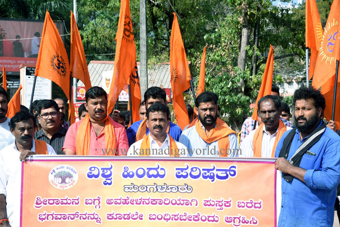 ಮಂಗಳೂರು, ಜನವರಿ .08: ಸಾಹಿತಿ ಭಗವಾನ್ ತಮ್ಮ ಪುಸ್ತಕದಲ್ಲಿ ಶ್ರೀರಾಮನನ್ನು ಅವಹೇಳನ ಮಾಡಿರುವುದನ್ನು ಖಂಡಿಸಿ ಹಾಗೂ ಭಗವಾನ್ ಬಂಧನಕ್ಕೆ ಆಗ್ರಹಿಸಿ ವಿಶ್ವ ಹಿಂದೂ ಪರಿಷತ್ ದಕ್ಷಿಣ ಕನ್ನಡ ಜಿಲ್ಲಾ ಘಟಕದ ವತಿಯಿಂದ ಸೋಮವಾರ ಜಿಲ್ಲಾಧಿಕಾರಿ ಕಚೇರಿ ಎದುರು ಪ್ರದರ್ಶನ ನಡೆಸಲಾಯಿತು.