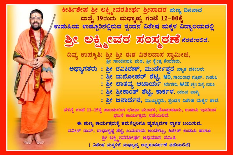 ಉಡುಪಿ: ಶಿರೂರು ಶ್ರೀ ಲಕ್ಷ್ಮೀವರ ಶ್ರೀಪಾದರು ವೃಂದಾವನಸ್ಥರಾಗಿ ಒಂದು ವರುಷ ಕಳೆದ ಹಿನ್ನಲೆಯಲ್ಲಿ ಶಿರೂರು ಶ್ರೀ ಅಭಿಮಾನಿಗಳು ಶಿರೂರು ಸ್ವಾಮಿಗಳ ಸಂಸ್ಮರಣೆ ಕಾರ್ಯಕ್ರಮವನ್ನು ನಡೆಸಲಿದ್ದಾರೆ.