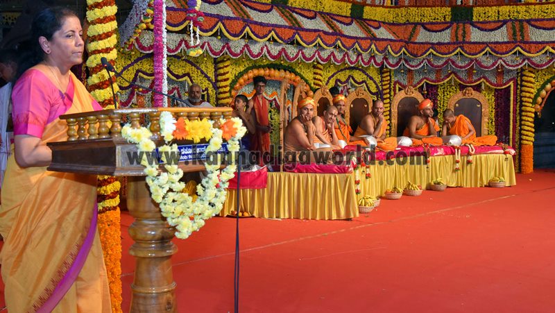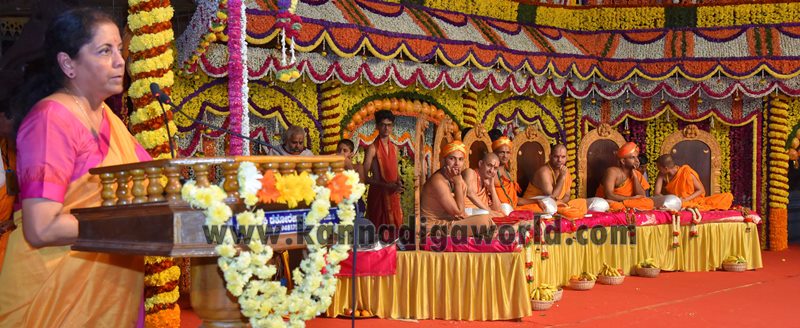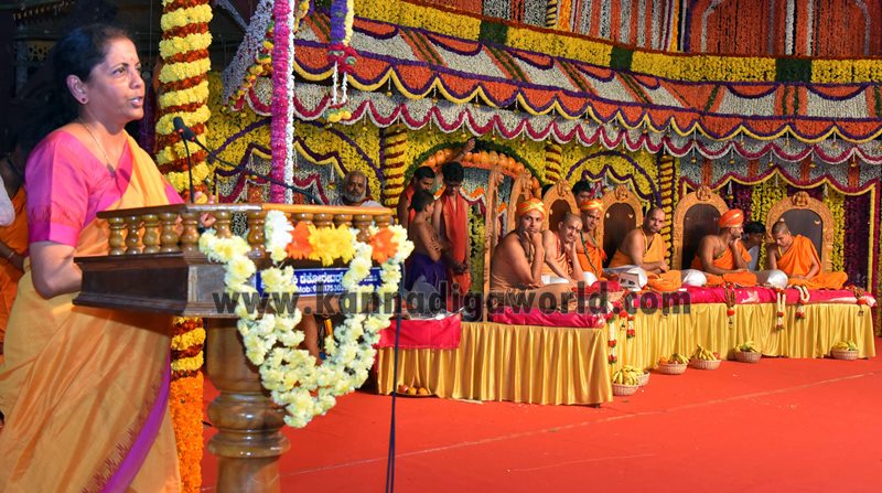 ಮುಖ್ಯ ಅತಿಥಿಯಾಗಿ ಆಗಮಿಸಿದ ಕೇಂದ್ರ ಸಚಿವೆ ನಿರ್ಮಲಾ ಸೀತಾರಾಮನ್, ಆಚಾರ್ಯ ಮಧ್ವಪ್ರಣೀತ ತತ್ವ ಪರಿಪಾಲನೆಯಿಂದ ಸಮಾಜ ಸುಭಿಕ್ಷೆ ಸಾಧ್ಯ. ಈ ನಿಟ್ಟಿನಲ್ಲಿ ಪರಿಸರಸಹ್ಯ ಯೋಜನೆಗಳನ್ನು ರೂಪಿಸಿರುವ ಅದಮಾರು ಶ್ರೀಗಳ ನಾಯಕತ್ವ ಸಮಾಜ ಬದಲಾವಣೆಗೆ ಅಗತ್ಯ ಎಂದರು. ಚಿಕ್ಕಂದಿನಿಂದಲೂ ಉಡುಪಿಯ ಈ ಮಟ್ಟದ ಪ್ರಭಾವ ತಮ್ಮ ಮೇಲೆ ಕಾಣಿಸಿಕೊಂಡಿದ್ದು, ಹಲವಾರು ಬಾರಿ ಬಂದು ಕೃಷ್ಣನ ದರ್ಶನ ಮಾಡಿದ್ದೇನೆ. 16ವರ್ಷಗಳ ಹಿಂದೆ ಅದಮಾರು ಮಠದ ಪರ್ಯಾಯ ನಡೆದಿದ್ದಾಗ ನಾನು ಉಡುಪಿಗೆ ಬಂದು ಅವರ ಆಶೀರ್ವಾದ ಪಡೆದಿದ್ದೆ. ಕಳೆದ ಸಪ್ಟೆಂಬರ್ ತಿಂಗಳಲ್ಲಿ ಪೇಜಾವರ ಮಠದ ಶ್ರೀ ವಿಶ್ವೇಶತೀರ್ಥ ಶ್ರೀಪಾದರು ಹೊಸದಿಲ್ಲಿಯ ನನ್ನ ಮನೆಗೆ ಬಂದು ಹರಿಸಿರುವುದು ನನಗೆ ಮರೆಯಲಾಗದ ಅನುಭವ ಎಂದರು.
