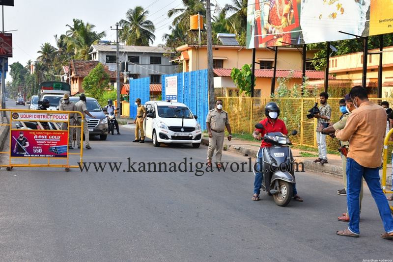 ಉಡುಪಿಯ ಕಲ್ಸಂಕ ಸರ್ಕಲ್ ನಲ್ಲಿ ದಿಢೀರ್ ತಪಾಸಣೆ ಆರಂಭಿಸಿದ ಜಿಲ್ಲಾಧಿಕಾರಿ ಜಿ ಜಗದೀಶ್ ಹಾಗೂ ಎಸ್ಪಿ ವಿಷ್ಣುವರ್ಧನ್ ಅವರು, ಪ್ರತಿಯೊಂದು ವಾಹನವನ್ನು ನಿಲ್ಲಿಸಿ ಹೊರಗೆ ಬಂದಿರುವುದರ ಉದ್ದೇಶದ ಬಗ್ಗೆ ಸವಾರರಲ್ಲಿ ಪ್ರಶ್ನಿಸಿದರು. ಆಸ್ಪತ್ರೆ, ಮೆಡಿಕಲ್, ಕೃಷಿ ಚಟುವಟಿಕೆ, ಸ್ಥಳೀಯವಾಗಿ ಸಾಮಾನು ಖರೀದಿಯಂತಹ ಅತ್ಯವಶ್ಯಕ ಕೆಲಸಗಳಿಗೆ ಬಂದಿರುವವರಿಗೆ ಮಾತ್ರ ಸಂಚಾರಕ್ಕೆ ಅನುಮತಿ ನೀಡಲಾಯಿತು. ಹಾಲಿನ ವಾಹನಗಳು, ಗೂಡ್ಸ್ ವಾಹನಗಳಿಗೆ ಸಂಚರಿಸಲು ಬಿಡಲಾಯಿತು. ಅನಾವಶ್ಯಕವಾಗಿ ಹೊರಗೆ ಬಂದಂತವರ ವಾಹನಗಳನ್ನು ಜಪ್ತಿ ಮಾಡಿ ಎಚ್ಚರಿಕೆ ನೀಡಲಾಯಿತು.