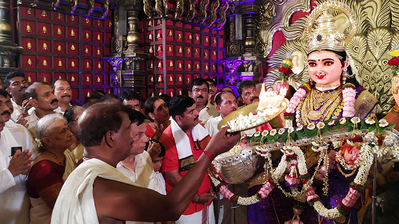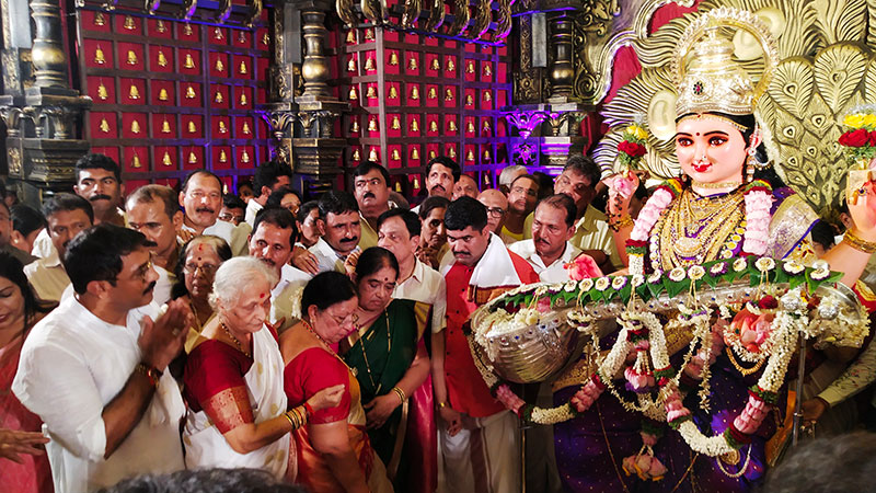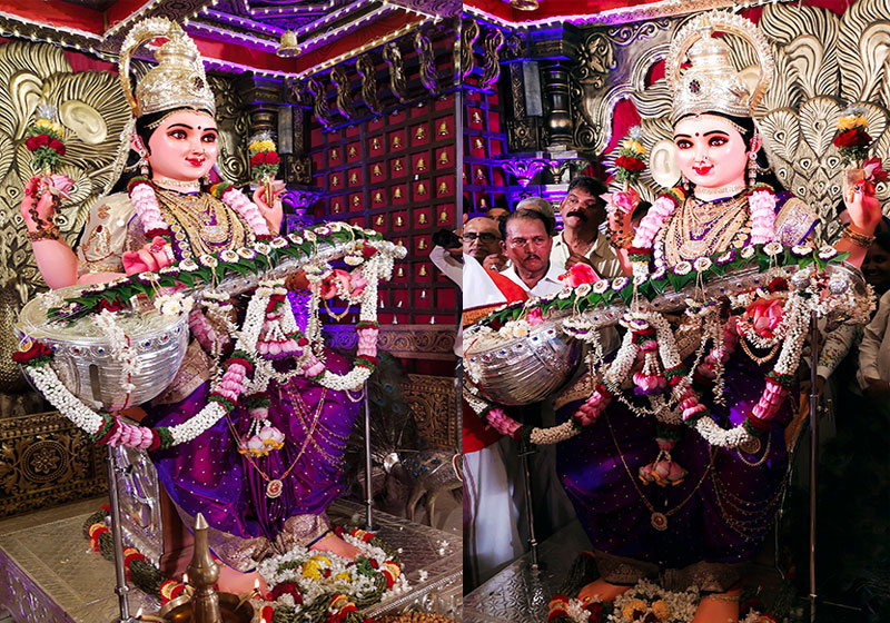 ಇಂದು ( ಸೋಮವಾರ) ಬೆಳಗ್ಗೆ 9.30ಕ್ಕೆ ಗುರುಪ್ರಾರ್ಥನೆ, ಪುಣ್ಯಾಹ ಹೋಮ, ನವಕಲಶಾಭಿಷೇಕ ಧರ್ನುಲಗ್ನ, ಕಲಶ ಪತ್ರಿಷ್ಠೆ ನಡೆಯಿತು. ಬಳಿಕ ಶ್ರೀ ಕ್ಷೇತ್ರದ ವರ್ಣರಂಜಿತ ಅದ್ದೂರಿ ದಸರಾ ದರ್ಬಾರ್ ಮಂಟಪದಲ್ಲಿ ಶ್ರೀ ಮಹಾಗಣಪತಿ ಮತ್ತು ನವದುರ್ಗೆಯರ ಹಾಗೂ ಶಾರದಾ ಪ್ರತಿಷ್ಠೆ ನೆರವೇರಿತು. ಆದಿಶಕ್ತಿ, ಮಹಾಗಣಪತಿಯೊಂದಿಗೆ ನವದುರ್ಗೆಯರಾದ ಶೈಲಪುತ್ರಿ, ಬ್ರಹ್ಮಚಾರಿಣಿ, ಚಂದ್ರಘಂಟಿ, ಕೂಷ್ಮಾಂಡಿನಿ, ಸ್ಕಂದ ಮಾತಾ, ಕಾತ್ಯಾಯಿನಿ, ಮಹಾಕಾಳಿ, ಮಹಾಗೌರಿ, ಸಿದ್ಧಿಧಾತ್ರಿಯರ ಪ್ರತಿಷ್ಠಾಪನೆ ನೆರವೇರಿತು. ಶ್ರೀಶಾರದೆಯ ಮೂರ್ತಿ ಎಂದಿನಂತೆ ಅತ್ಯಾಕರ್ಷಕವಾಗಿ ರೂಪುಗೊಂಡಿದ್ದು ಭಕ್ತರ ಮನ ಸೆಳೆಯುತ್ತಿದೆ.