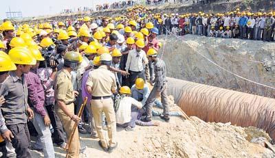 ರಾಯಚೂರು ಸಮೀಪ ವೈಟಿಪಿಎಸ್‌ನಲ್ಲಿ ಶುಕ್ರವಾರ ಕೆಲಸ ಮಾಡುವಾಗ ಮಣ್ಣು ಕುಸಿದು ಮೃತಪಟ್ಟ ಕಾರ್ಮಿಕರ ದೇಹಗಳನ್ನು ನೋಡಲು ನೂರಾರು ಕಾರ್ಮಿಕರು ಜಮಾಯಿಸಿರುವುದು ಪ್ರಜಾವಾಣಿ ಚಿತ್ರ/ಶ್ರೀನಿವಾಸ ಇನಾಂದಾರ