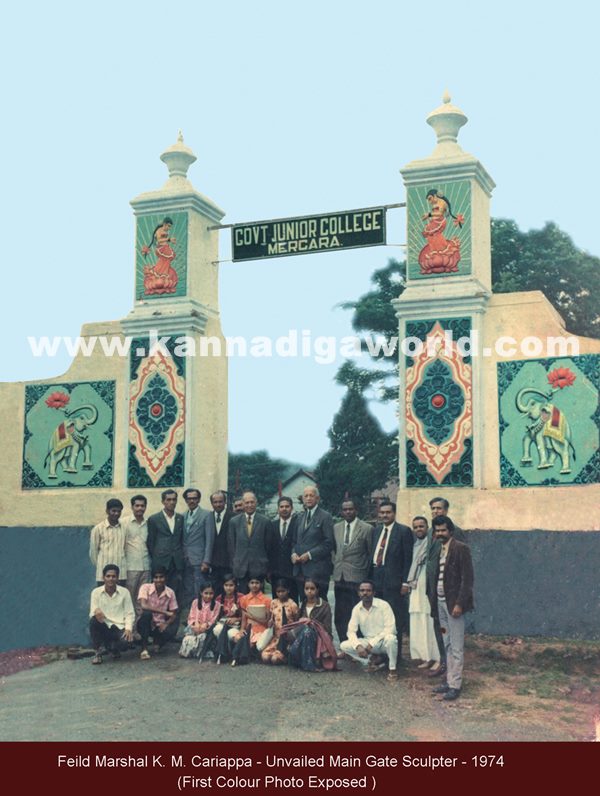 ಮಡಿಕೇರಿ ಜೂನಿಯರ್ ಕಾಲೇಜಿನ ಅಂದಿನ ಪ್ರಾಂಶುಪಾಲರಾಗಿದ್ದ ಶ್ರೀ ಪಿ. ಪಿ. ಅಯ್ಯಣ್ಣ ನವರು ಕಲಾಭಿರುಚಿಯುಳ್ಳ ವ್ಯಕ್ತಿತ್ವದವರಾಗಿದ್ದರು. ಅದರ ಫಲವಾಗಿ ಕಾಲೇಜಿನ ಬೃಹತ್ ಮಹಾದ್ವಾರದಲ್ಲಿ ಶಿಲ್ಪ ಕೆತ್ತನೆಯನ್ನು ಮಾಡಿಸಿದರು. ಅದರ ಉದ್ಘಾಟನೆಯನ್ನು 1973 ರಲ್ಲಿ ಅದೇ ವಿಧ್ಯಾಸಂಸ್ಥೆಯ ಹಳೆಯ ವಿದ್ಯಾರ್ಥಿಯಾದ ಫಿ. ಮಾ. ಕೆ. ಎಂ. ಕಾರಿಯಪ್ಪನವರಿಂದ ಮಾಡಿಸಿದರು. ಆ ಸಂದರ್ಭದಲ್ಲಿ ಕಲಾಕೃತಿ ರಚನೆ ಮಾಡುವ ಅವಕಾಶ ನನಗೆ ದೊರೆತುದರಿಂದ, ಸಮಾರಂಭದಲ್ಲಿ ಶಿಲ್ಪಕಲಾವಿದನಾದ ನನ್ನನ್ನು ಫಿ. ಮಾ. ಕಾರ್ಯಪ್ಪನವರಿಂದ ಸನ್ಮಾನಿಸಿ ಗೌರವಿಸಿದರು. ಅಂದಿನ ಆ ಸನ್ಮಾನ ಗೌರವ, ಆಶಿರ್ವಾದ ನನ್ನ ಕಲಾ ಜೀವನದ ಪ್ರಥಮ ಸೌಭಾಗ್ಯವಾಗಿತ್ತು. ಅಂದಿನ ದಿನ ತೆಗೆದ ಸಮಾರಂಭದ ಛಾಯಚಿತ್ರ ಕೊಡಗಿನಲ್ಲೆ ಪ್ರಥಮ ವರ್ಣರಂಜಿತ ಚಿತ್ರವಾಗಿತ್ತು. ಚಿತ್ರತೆಗೆದ ಫಿಲಂನ್ನು ಮುಂಬಯಿಯಲ್ಲಿ ಸಂಸ್ಕರಿಸಿ ಮುದ್ರಣ ಮಾಡಿಸಲಾಗಿತ್ತು.