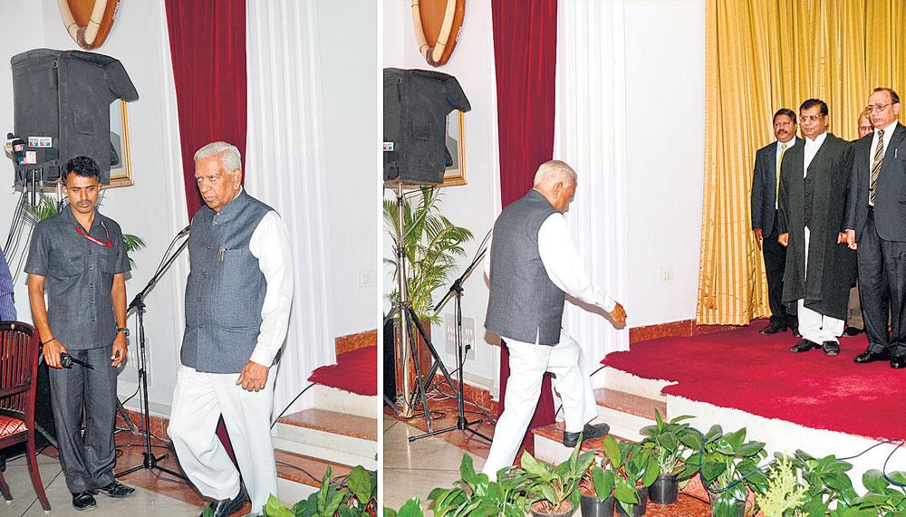 ರಾಜಸ್ತಾನದಿಂದ ರಾಜ್ಯ ಹೈಕೋರ್ಟ್ಗೆ ವರ್ಗವಾಗಿ ಬಂದಿರುವ ಚೌಹಾಣ್ ಅವರಿಗೆ ರಾಜಭವನದ ಬ್ಯಾಂಕ್ವೆಟ್ ಹಾಲ್ನಲ್ಲಿ ಬೆಳಿಗ್ಗೆ 9.30ಕ್ಕೆ ಪ್ರಮಾಣ ವಚನ ಸ್ವೀಕಾರ ಸಮಾರಂಭ ಏರ್ಪಡಿಸಲಾಗಿತ್ತು. ಪ್ರತಿಜ್ಞಾವಿಧಿ ಬೋಧನೆ ನಂತರ ಪೊಲೀಸ್ ಬ್ಯಾಂಡ್ ರಾಷ್ಟ್ರಗೀತೆ ನುಡಿಸಲು ಆರಂಭಿಸಿತು. ಆಗ ರಾಜ್ಯಪಾಲರು ವೇದಿಕೆ ಬಿಟ್ಟು ಕೆಳಗಿಳಿದು ಹೊರಟರು.