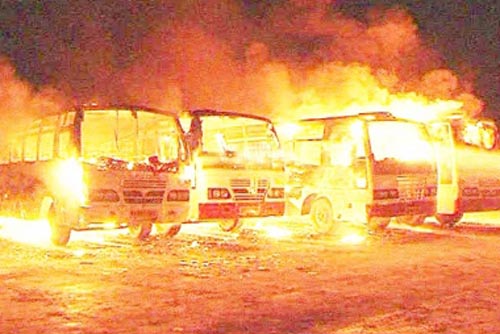 ರಾಯಚೂರು, ಅ.2: ರಾಜ್ಯ ರಸ್ತೆ ಸಾರಿಗೆ ಸಂಸ್ಥೆಗೆ ಸೇರಿದ ನಾಲ್ಕು ಬಸ್ಸುಗಳಿಗೆ ಕಿಡಿಗೇಡಿಗಳು ಬೆಂಕಿ ಹಚ್ಚಿರುವ ಘಟನೆ ನಗರದ ಬಸ್ ಡಿಪೋದಲ್ಲಿ ನಡೆದಿದೆ. ನಾಲ್ಕು ಬಸ್ಸುಗಳು ಬೆಂಕಿಗೆ ಆಹುತಿಯಾಗಿದ್ದು ಅಗ್ನಿಶಾಮಕದಳದವರು ಕೂಡಲೇ ಸ್ಥಳಕ್ಕೆ ಧಾವಿಸಿ ಬೆಂಕಿ ನಂದಿಸಿ ಮುಂದಾಗಬಹುದಾದ ಅನಾಹುತವನ್ನು ತಪ್ಪಿಸಿದರು.