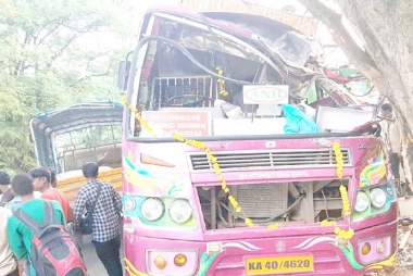 ಚಿಂತಾಮಣಿ, ಅ.11- ಅತಿವೇಗ ಹಾಗೂ ಅಜಾಗರೂಕತೆಯಿಂದ ಚಾಲನೆ ಮಾಡಿಕೊಂಡು ಬಂದ ಟೆಂಪೋ ಚಾಲಕ ಬಸ್ಗೆ ಡಿಕ್ಕಿ ಹೊಡೆಯುತ್ತಿದ್ದು, ಇದನ್ನು ತಪ್ಪಿಸಲು ಹೋದ ಬಸ್ ಚಾಲಕ ಮರಕ್ಕೆ ಡಿಕ್ಕಿ ಹೊಡೆದಿದ್ದರಿಂದ ಬಸ್ನಲ್ಲಿದ್ದ 40 ಮಂದಿಗೆ ಸಣ್ಣಪುಟ್ಟ ಗಾಯಗಳಾಗಿದ್ದು, ಇವರಲ್ಲಿ ಐದು ಮಂದಿಗ ಗಂಭೀರಗೊಂಡಿರುವ ಘಟನೆ ಗ್ರಾಮಾಂತರ ಠಾಣೆ ವ್ಯಾಪ್ತಿಯಲ್ಲಿ ನಡೆದಿದೆ. ಘಟನೆಯಲ್ಲಿ ಫರಿದಾ (50) ಎಂಬುವರಿಗೆ ತೀವ್ರ ತರ ಗಾಯಗಳಾಗಿದ್ದು, ಇವರನ್ನು ಬೆಂಗಳೂರಿನ ನಿಮ್ಹಾನ್ಸ್ಗೆ ಸೇರಿಸಲಾಗಿದೆ.