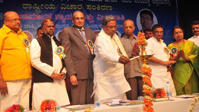 ರವಿವಾರ ನಗರದ ಗಾಂಧಿ ಭವನದಲ್ಲಿ ಹಿಂದುಳಿದ ವರ್ಗಗಳ ಒಕ್ಕೂಟ, ವಾಲ್ಮೀಕಿ ನಾಯಕ ಮಹಾಸಭಾ, ಸಮಾಜ ವೇದಿಕೆ ಆಶ್ರಯದಲ್ಲಿ ಏರ್ಪಡಿಸಿದ್ದ ‘ಸಾಮಾಜಿಕ ನ್ಯಾಯ ಮತ್ತು ಮೀಸಲಾತಿ’ ಕುರಿತ ರಾಷ್ಟ್ರೀಯ ವಿಚಾರ ಸಂಕಿರಣವನ್ನು ಉದ್ಘಾಟಿಸಿ ಅವರು ಮಾತನಾಡಿದರು.