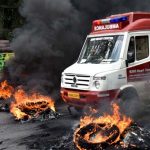 An armoured police car patrols during a curfew following violence in the city due to the Cauvery water sharing dispute with neighbouring state Tamil Nadu, at Sunkadakatte in Bangalore on Tuesday. -Photo/ Ranju P