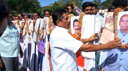 ಮೈಸೂರು: ಮಹಾದಾಯಿ ಮತ್ತು ಕಾವೇರಿ ವಿಚಾರದಲ್ಲಿ ರಾಜ್ಯದ ಪರ ಧ್ವನಿ ಎತ್ತದ ಬಿಜೆಪಿಯ ಸಂಸದರ ಭಾವಚಿತ್ರಕ್ಕೆ ಸನ್ಮಾನ ಮಾಡಿ ಕಾಂಗ್ರೆಸ್ ಕಾರ್ಯಕರ್ತರು ಭಾನುವಾರ ಪ್ರತಿಭಟನೆ ನಡೆಸಿದರು.
