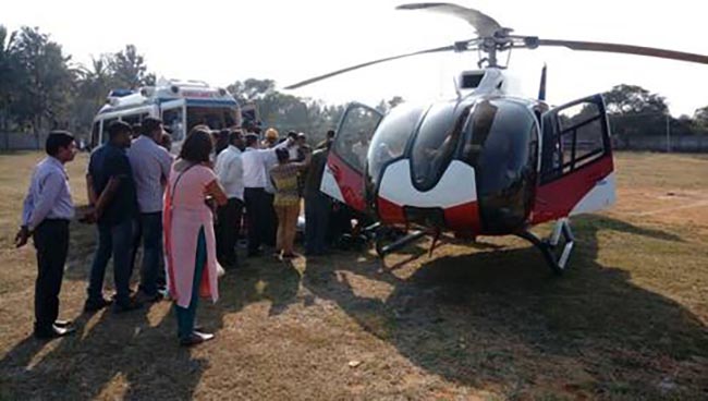 ಅಲ್ಲದೇ ರೋಗಿಗೆ ಯಾವುದೇ ತೊಂದರೆಯಾಗದಂತೆ ಹೆಲಿಕಾಪ್ಟ್ರ್ನಲ್ಲಿಯೇ ಇದ್ದ ಆಕ್ಸಿಜನ್ ಹಾಗೂ ತುರ್ತು ನಿಘಾ ಘಟಕ ವ್ಯವಸ್ಥೆಯಿಂದ ಸಂದೀಪ್ನನ್ನು ಬೆಂಗಳೂರಿಗೆ ತರಲಾಗಿದೆ.