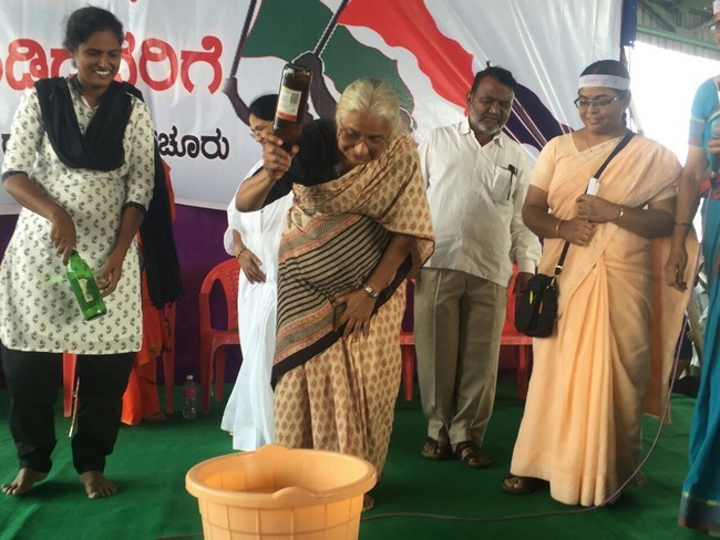 ರಾಯಚೂರಿನಲ್ಲಿ ಮದ್ಯ ನಿಷೇಧಕ್ಕೆ ಆಗ್ರಹಿಸಿ ಎಪಿಎಂಸಿ ಆವರಣದಲ್ಲಿಆಯೋಜಿಸಿರುವ ರಾಜ್ಯಮಟ್ಟದ ಸಮಾವೇಶಕ್ಕೆ ನಶಾಮುಕ್ತ ಭಾರತ ಸಂಘಟನೆಯ ಹೋರಾಟಗಾರ್ತಿ ಮೇಧಾ ಪಾಟ್ಕರ್ ಮದ್ಯದ ಬಾಟಲಿ ಒಡೆದು ಚಾಲನೆ ನೀಡಿದರು.