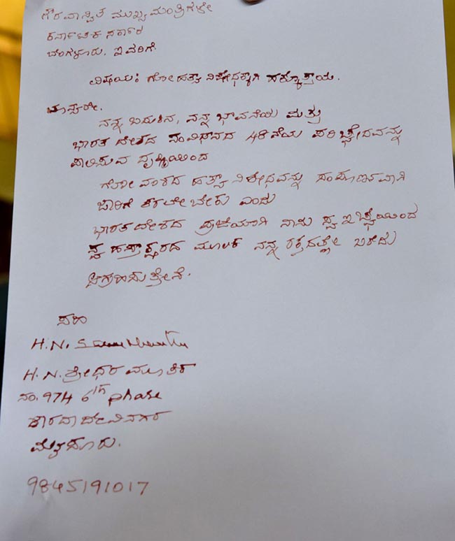 ಮೈಸೂರು: ಗೋಹತ್ಯೆ ನಿಷೇಧಕ್ಕೆ ಆಗ್ರಹಿಸಿ ಹಾಗೂ ದೇಸಿ ತಳಿಯ ಗೋವುಗಳನ್ನು ರಕ್ಷಿಸುವಂತೆ ಒತ್ತಾಯಿಸಿ ಐವರು ಸ್ವಾಮೀಜಿಗಳು ಪ್ರಧಾನಮಂತ್ರಿ ಹಾಗೂ ಮುಖ್ಯಮಂತ್ರಿಗೆ ರಕ್ತದಲ್ಲಿ ಪತ್ರ ಬರೆದರು.