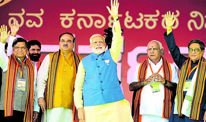 ‘ಕರ್ನಾಟಕದ ನನ್ನ ಪ್ರೀತಿಯ ಬಂಧು ಭಗಿನಿಯರೆ ನಿಮಗೆಲ್ಲ ನನ್ನ ನಮಸ್ಕಾರಗಳು. ನಾಡಪ್ರಭು ಕೆಂಪೇಗೌಡರು, ಮಹಾತ್ಮ ಬಸವೇಶ್ವರರು, ಮಾದಾರ ಚೆನ್ನಯ್ಯ, ವೀರರಾಣಿ ಕಿತ್ತೂರು ಚೆನ್ನಮ್ಮಾ, ಸಂಗೊಳ್ಳಿ ರಾಯಣ್ಣ, ಶಿಶುನಾಳ ಷರೀಫ, ಸರ್.ಎಂ. ವಿಶ್ವೇಶ್ವರಯ್ಯ ಅವರಂತಹ ಮಹಾಪುರುಷರ ನಾಡು ಕರ್ನಾಟಕ. ನವ ಕರ್ನಾಟಕದ ನಿರ್ಮಾಣಕ್ಕಾಗಿ ಪರಿವರ್ತನೆ ಮಾಡಲು ಬಿಜೆಪಿಯನ್ನು ಗೆಲ್ಲಿಸಿ’ ಎಂದು ಮೋದಿ ಕನ್ನಡದಲ್ಲೇ ಕೋರಿದರು.