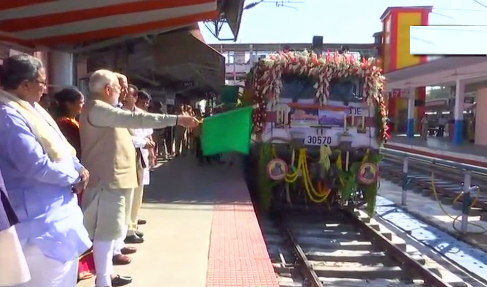 ಶ್ರವಣಬೆಳಗೊಳದಿಂದ ಮೈಸೂರಿಗೆ ಆಗಮಿಸಿದ ಪ್ರಧಾನಿ, ಮೈಸೂರಿನ ರೈಲ್ವೆ ನಿಲ್ದಾಣದ ಪ್ಲಾಟ್ ಫಾರಂ 1ರಲ್ಲಿ ರೈಲುಗಳ ಸಂಚಾರಕ್ಕೆ ಚಾಲನೆ ನೀಡಿದರು.