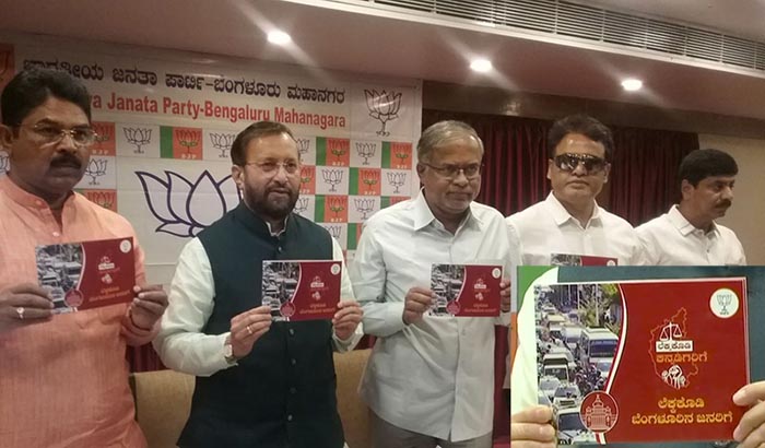 ‘ಬೆಂಗಳೂರು ರಕ್ಷಿಸಿ ಪಾದಯಾತ್ರೆ’ ಅಭಿಯಾನದ ಅಂಗವಾಗಿ ಸಿದ್ಧಪಡಿಸಿರುವ ‘ಲೆಕ್ಕಕೊಡಿ ಬೆಂಗಳೂರಿನ ಜನರಿಗೆ’ ‘ಚಾರ್ಜ್ ಶೀಟ್’ಅನ್ನು ಪಕ್ಷದ ರಾಜ್ಯ ಚುನಾವಣಾ ಉಸ್ತುವಾರಿ ಪ್ರಕಾಶ್ ಜಾವಡೇಕರ್ ಗುರುವಾರ ಬಿಡುಗಡೆ ಮಾಡಿದರು.