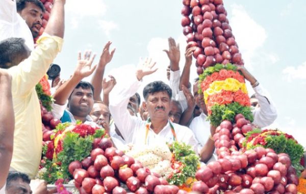 ಮಂಡ್ಯದಲ್ಲಿ ಗುರುವಾರ ಸಂಧಾನ ರಾಜಕಾರಣ ನಡೆಯಿತು. ಶ್ರೀರಂಗಪಟ್ಟಣ ಕ್ಷೇತ್ರದ ಟಿಕೆಟ್ ಆಕಾಂಕ್ಷಿ ಸಚ್ಚಿದಾನಂದ ಅವರನ್ನು ಮನವೊಲಿಸುವ ಸಲುವಾಗಿ ಸಂಧಾನಕಾರರಾಗಿ ಮಂಡ್ಯ ತಾಲೂಕಿನ ಇಂಡುವಾಳು ಗ್ರಾಮಕ್ಕೆ ಆಗಮಿಸಿದ ಸಚಿವ ಡಿ.ಕೆ.ಶಿವಕುಮಾರ್ ಅವರ ಕೊರಳಿಗೆ 3 ಕ್ವಿಂಟಾಲ್ ಸೇಬಿನ ಹಾರವನ್ನು ಕ್ರೇನ್ ಮೂಲಕ ಹಾಕಲಾಯಿತು. ಇದೇವೇಳೆ ಜೆಸಿಬಿಯಲ್ಲಿ ಕೂತು ಹೂವಿನ ಮಳೆ ಕೂಡ ಸುರಿಸಲಾಯಿತು. ಇದು ಸಚ್ಚಿದಾನಂದ ಅವರ ಬೆಂಬಲಿಗರು ಯಶಸ್ವಿ ಸಂಧಾನ ಕೋರಿ ಮಾಡಿದ ಸನ್ಮಾನವಿರಬಹುದು ಎಂದು ಜನರು ಮಾತನಾಡಿಕೊಳ್ಳುತ್ತಿದ್ದರು.