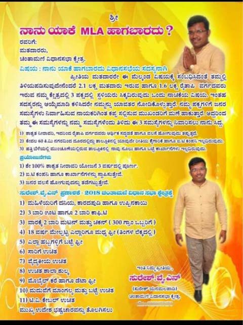 ವೈ ಎನ್ ಸುರೇಶ್ ನಾನು ಯಾಕೆ ಎಂಎಲ್ಎ ಆಗಬಾರದು ಎಂದು ಹೆಡ್ಲೈನ್ ಹಾಕಿ ಚುನಾವಣಾ ಪ್ರಣಾಳಿಕೆಯನ್ನು ತಯಾರಿಸಿದ್ದಾರೆ.