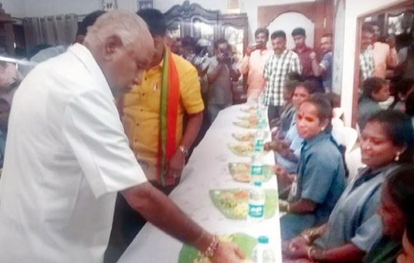 ರಾಧಾಕೃಷ್ಣ ವಾರ್ಡ್ನ 25ಕ್ಕೂ ಹೆಚ್ಚು ಪೌರ ಕಾರ್ಮಿಕರನ್ನು ತಮ್ಮ ಡಾಲರ್ ಕಾಲೋನಿ ನಿವಾಸಕ್ಕೆ ಆಹ್ವಾನಿಸಿ ಸ್ವತಃ ತಾವೇ ಬಡಿಸಿ ಭೋಜನ ನೀಡಿ ಉಪಚರಿಸಿದರು. ಅವರೊಂದಿಗೆ ಶಾಸಕ ವೈ.ಎ.ನಾರಾಯಣಸ್ವಾಮಿ ಕೂಡ ಭೋಜನ ಸವಿದರು.