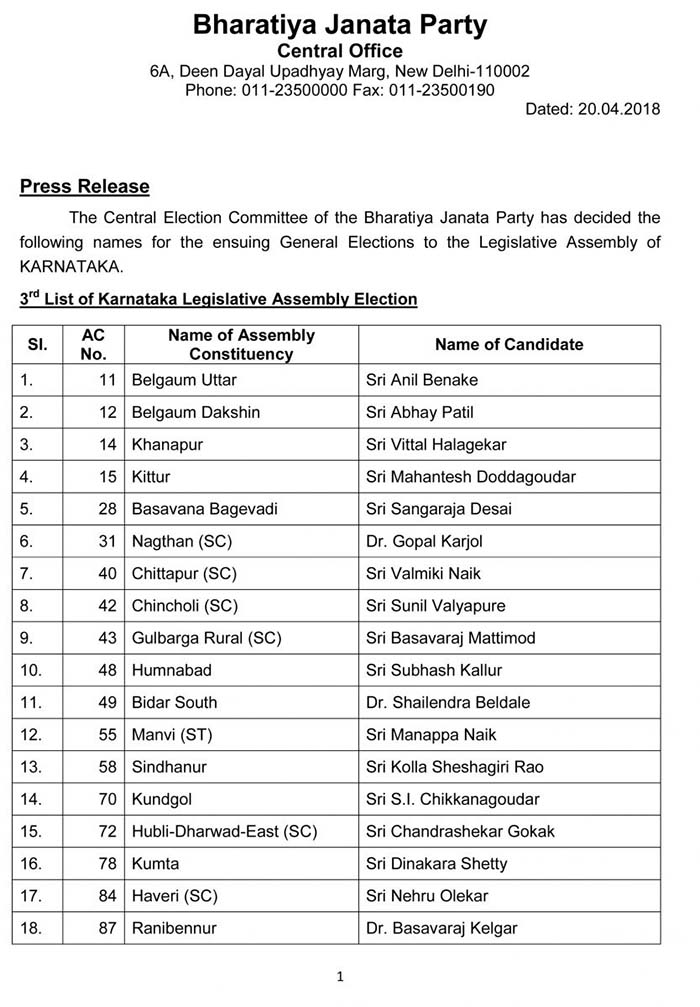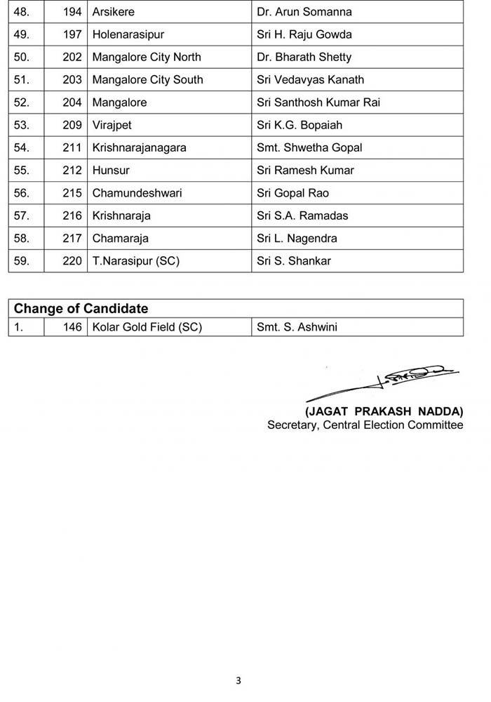 ನಿರೀಕ್ಷೆಯಂತೆಯೇ ಹರಪನಹಳ್ಳಿಯಿಂದ ಮಾಜಿ ಸಚಿವ, ರೆಡ್ಡಿ ಸಹೋದರ, ಕರುಣಾಕರ ರೆಡ್ಡಿ, ಕೃಷ್ಣರಾಜ ವಿಧಾನಸಭಾ ಕ್ಷೇತ್ರಕ್ಕೆ ಮಾಜಿ ಸಚಿವ ಎಸ್ಎ ರಾಮ್ ದಾಸ್, ವಿರಾಜಪೇಟೆ ವಿಧಾನಸಭಾ ಕ್ಷೇತ್ರಕ್ಕೆ ಬೋಪಯ್ಯ ಅವರಿಗೆ ಟಿಕೆಟ್ ನೀಡಲಾಗಿದ್ದು ಒಟ್ಟು 59 ಮಂದಿಗೆ ಬಿಜೆಪಿ ಟಿಕೆಟ್ ನೀಡಿದೆ.