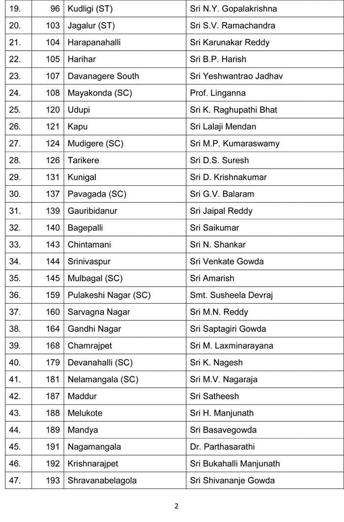 * ಹರಿಹರ ಕ್ಷೇತ್ರಕ್ಕೆ ಬಿ.ಪಿ. ಹರೀಶ್, ದಾವಣಗೆರೆ ದಕ್ಷಿಣ ಕ್ಷೇತ್ರಕ್ಕೆ ಯಶವಂತರಾವ್ ಜಾಧವ್ಗೆ ನೀಡಲಾಗಿದೆ.