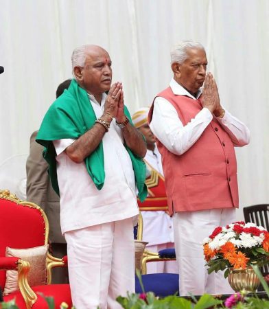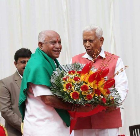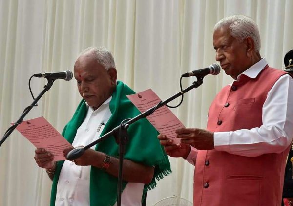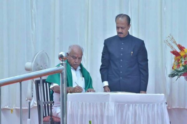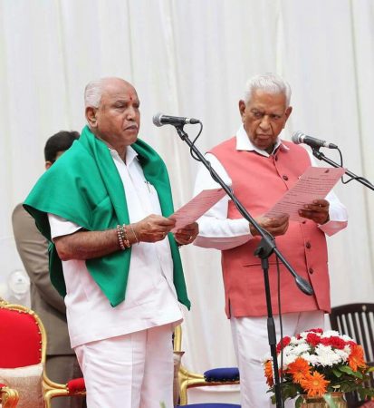 ಬೆಂಗಳೂರಿನ ರಾಜಭವನದ ಆವರಣದಲ್ಲಿರುವ ಗಾಜಿನ ಮನೆಯಲ್ಲಿ ಬಿಎಸ್ ವೈ ಮುಖ್ಯಮಂತ್ರಿಯಾಗಿ ಪ್ರಮಾಣ ವಚನ ಸ್ವೀಕರಿಸಿದ್ದು, ರಾಜ್ಯಪಾಲ ವಜುಭಾಯಿ ವಾಲಾ ಅವರು ಬಿಎಸ್ ವೈಗೆ ಪ್ರತಿಜ್ಞಾ ವಿಧಿ ಬೋಧಿಸಿದರು.