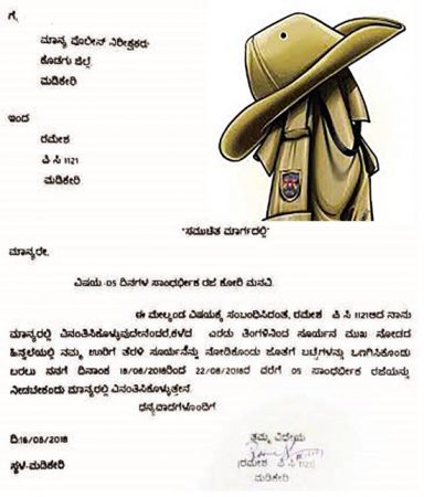 ಈ ಪತ್ರದಲ್ಲಿ, ‘ರಮೇಶ ಪಿಸಿ 1121 ಮಡಿಕೇರಿ. ಐದು ದಿನಗಳ ಸಾಂದರ್ಭಿಕ ರಜೆ ಕೋರಿ ಮನವಿ. ಎರಡು ತಿಂಗಳಿನಿಂದ ಸೂರ್ಯನ ಮುಖ ನೋಡದ ಹಿನ್ನೆಲೆಯಲ್ಲಿ ನನ್ನ ಊರಿಗೆ ತೆರಳಿ ಸೂರ್ಯನನ್ನು ನೋಡಿಕೊಂಡು ಜೊತೆಗೆ ಬಟ್ಟೆಯನ್ನು ಒಣಗಿಸಿಕೊಂಡು ಬರಲು 5 ದಿನ ಸಾಂದರ್ಭಿಕ ರಜೆಯನ್ನು ನೀಡಬೇಕೆಂದು ವಿನಂತಿಸಿಕೊಳ್ಳುತ್ತೇನೆ’ ಎಂದಿದೆ ಸದ್ಯ ಈ ಪತ್ರ ಸಾಮಾಜಿಕ ಜಾಲತಾಣಗಳಲ್ಲಿ ವೈರಲ್ ಆಗಿದೆ. ಆದರೆ ನಿಜಕ್ಕೂ