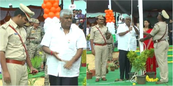 ಹಾಸನ: ಸ್ವಾತಂತ್ರ್ಯ ದಿನಾಚರಣೆಯಲ್ಲಿ ಸಚಿವ ರೇವಣ್ಣ ಎಂದಿನಂತೆ ತಮ್ಮ ವಾಸ್ತು ವಿಶೇಷತೆಯಿಂದ ಗಮನ ಸೆಳೆದಿದ್ದಾರೆ. ಖುದ್ದು ಎಸ್ಪಿಯವರ ಮೊಬೈಲ್ನಲ್ಲಿ ಟೈಂ ಚೆಕ್ ಮಾಡಿ, ಚಪ್ಪಲಿ ಬಿಟ್ಟು ಧ್ವಜಾರೋಹಣ ನಡೆಸಿದರು.