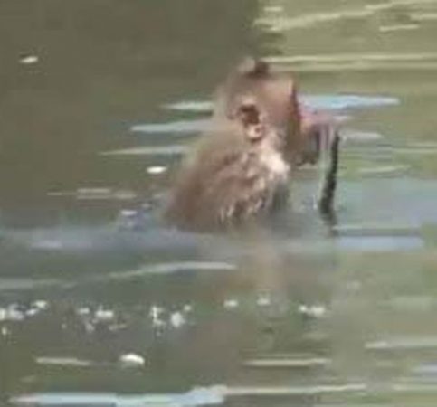 ಕೆರೆಗೆ ಹಾರಿದ ಬಳಿಕ ಮಾವಿನಕಾಯಿ ತುಂಡು ಹಿಡಿದುಕೊಂಡು, ತನ್ನ ಪುಟ್ಟ ಮರಿಯನ್ನು ತಲೆಯ ಮೇಲೆ ಹೊತ್ತುಕೊಂಡು ಈಜಿ ದಡ ಸೇರಿದೆ. ಕೆಲ ಕೋತಿಗಳು ಕೆರೆಯ ದಂಡೆಯ ಮೇಲೆ ಪ್ರವಾಸಿಗರು ಎಸೆದ ಆಹಾರ ತಿಂದು, ತಮ್ಮ ಮರಿಗಳಿಗೂ ತಿನಿಸಿವೆ.