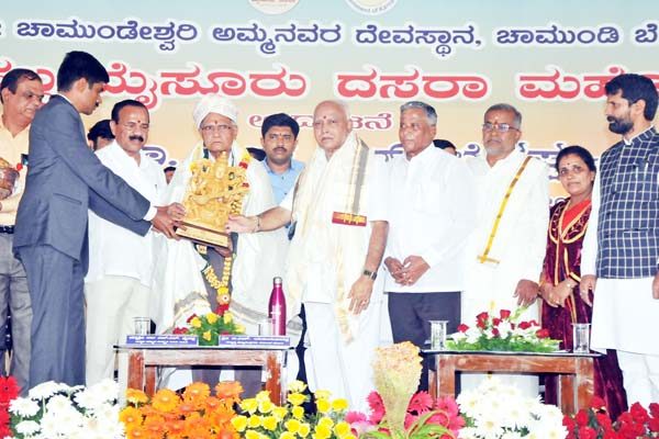 ಮೈಸೂರು: ವಿಶ್ವವಿಖ್ಯಾತ ಮೈಸೂರು ದಸರಾಗೆ ರವಿವಾರ ವಿದ್ಯುಕ್ತ ಚಾಲನೆ ದೊರಕಿತು. ಸಾಹಿತಿ ಡಾ. ಎಸ್ ಎಲ್ ಭೈರಪ್ಪ ಮತ್ತು ಮುಖ್ಯಮಂತ್ರಿ ಬಿ ಎಸ್ ಯಡಿಯೂರಪ್ಪ ದೀಪ ಬೆಳಗಿಸಿ, ಚಾಮುಂಡಿ ದೇವಿ ಉತ್ಸವ ಮೂರ್ತಿಗೆ ಪುಷ್ಪಾರ್ಚಾನೆ ಮಾಡುವ ಮೂಲಕ ನಾಡಹಬ್ಬವನ್ನು ಉದ್ಘಾಟನೆ ಮಾಡಿದರು.
