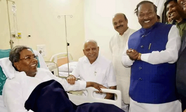 ಬೆಂಗಳೂರು(ಡಿ.12): ತೀವ್ರ ಹೃದಯ ಸಮಸ್ಯೆಯಿಂದಾಗಿ ಆಂಜಿಯೋಪ್ಲಾಸ್ಟ್ ಶಸ್ತ್ರ ಚಿಕಿತ್ಸೆಗೆ ಒಳಗಾದ ಮಾಜಿ ಸಿಎಂ ಸಿದ್ದರಾಮಯ್ಯರನ್ನು ಮುಖ್ಯಮಂತ್ರಿ ಬಿ.ಎಸ್ ಯಡಿಯೂರಪ್ಪ ಭೇಟಿ ಮಾಡಿ ಆರೋಗ್ಯ ವಿಚಾರಿಸಿದ್ದಾರೆ. ಇಂದು ಸಂಜೆ 7 ಗಂಟೆಗೆ ಮಲ್ಲೇಶ್ವರಂನ ಖಾಸಗಿ ಆಸ್ಪತ್ರೆಗೆ ಭೇಟಿ ನೀಡಿದ ಸಿಎಂ ಸಿದ್ದರಾಮಯ್ಯರ ಯೋಗಕ್ಷೇಮ ವಿಚಾರಿಸಿ ಧೈರ್ಯ ತುಂಬಿದ್ದಾರೆ. ಈ ವೇಳೆ ಸಿಎಂ ಬಿ.ಎಸ್ ಯಡಿಯೂರಪ್ಪರೊಂದಿಗೆ ಸಚಿವ ಕೆ.ಎಸ್ ಈಶ್ವರಪ್ಪ ಮತ್ತು ಗೃಹ ಸಚಿವ ಬಸವರಾಜ್ ಬೊಮ್ಮಾಯಿ ಉಪಸ್ಥಿತರಿದ್ದರು.