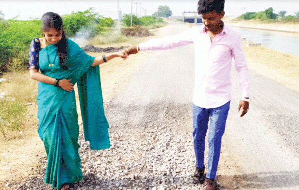 ನವ ದಂಪತಿಯಿಂದ ಹಾಳಾದ ರಸ್ತೆ ಮೇಲೆ ಫೋಟೋ ಶೂಟ್