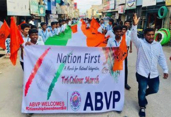 ಚಿಂತಾಮಣಿ (ಚಿಕ್ಕಬಳ್ಳಾಪುರ): ಕೇಂದ್ರ ಸರಕಾರ ಜಾರಿಗೆ ತಂದಿರುವ ಪೌರತ್ವ ತಿದ್ದುಪಡಿ ಕಾಯ್ದೆಯನ್ನು ಸ್ವಾಗತಿಸಿ ಅಖಿಲ ಭಾರತೀಯ ವಿದ್ಯಾರ್ಥಿ ಪರಿಷತ್‌ (ಎಬಿವಿಪಿ) ವಿದ್ಯಾರ್ಥಿಗಳು ನಗರದ ಪ್ರಮುಖ ಬೀದಿಗಳಲ್ಲಿ ತಿರಂಗ ರ‍್ಯಾಲಿ ನಡೆಸಿದರು.