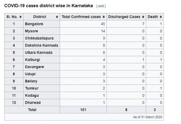 ಈವರೆಗೆ ಬೆಂಗಳೂರಿನಲ್ಲಿ 45, ಮೈಸೂರಿನಲ್ಲಿ 14 ಮಂದಿಗೆ ಸೋಂಕು ತಗುಲಿದೆ. ಮಾರ್ಚ್ 30ರವರೆಗಿನ ವರದಿ ಪ್ರಕಾರ, ಭಾರತದ 7 ರಾಜ್ಯದಲ್ಲಿ ಕೊರೊನಾ ವೈರಸ್ ವೇಗವಾಗಿ ಹರಡುತ್ತಿದೆ. ದೆಹಲಿ, ಜಮ್ಮು ಮತ್ತು ಕಾಶ್ಮೀರ, ಆಂಧ್ರ ಪ್ರದೇಶ, ಉತ್ತರ ಪ್ರದೇಶ, ಪಶ್ಚಿಮ ಬಂಗಾಳ, ಮಹಾರಾಷ್ಟ್ರ, ತಮಿಳುನಾಡಿನಲ್ಲಿ ಕೋವಿಡ್-19 ಅಟ್ಟಹಾಸ ಮೆರೆಯುತ್ತಿದೆ.