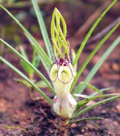 ತಿಳಿ ಹಸಿರು ಮತ್ತು ತಿಳಿ ಗುಲಾಬಿ ಮಿಶ್ರಿತ ವರ್ಣದಿಂದ ಕೂಡಿದ್ದು, ಕೊಳವೆ ಆಕಾರದ ರಚನೆ ಹೊಂದಿರುವ ಹೂವಿನ ದಳಗಳು ನೀಳವಾಗಿ ಬೆಳೆದು ತುದಿಯಲ್ಲಿ ಸುರುಳಿಗಟ್ಟುತ್ತದೆ. ಆದ್ದರಿಂದ ಇದಕ್ಕೆ ಸುರುಳಿ ಸೆರೋಪೆಜಿಯಾ ಎನ್ನುತ್ತಾರೆ.