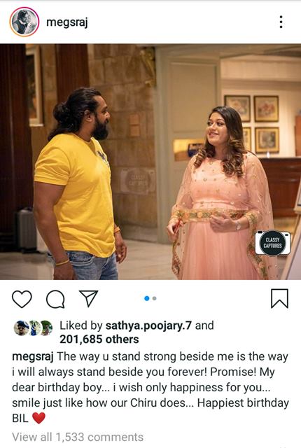 ಧ್ರುವ ಹುಟ್ಟುಹಬ್ಬದ ಹಿನ್ನೆಲೆ ತಮ್ಮ ಇನ್‍ಸ್ಟಾಗ್ರಾಮ್‍ನಲ್ಲಿ ಫೋಟೋ ಹಂಚಿಕೊಂಡಿರುವ ಮೇಘನಾ, ‘ನನ್ನ ಕಷ್ಟದ ಸಮಯದಲ್ಲಿ ನೀನು ಹೇಗೆ ನನ್ನ ಜೊತೆಯಲ್ಲಿ ಗಟ್ಟಿಯಾಗಿ ನಿಂತಿದ್ದೆ ಹಾಗೆಯೇ ನಾನು ಕೂಡ ಶಾಶ್ವತವಾಗಿ ನಿನ್ನ ಪಕ್ಕ ನಿಲ್ಲುತ್ತೇನೆ. ಪ್ರಾಮಿಸ್ ಬರ್ತ್‍ಡೇ ಬಾಯ್. ಸದಾ ನೀನು ಖುಷಿಯಾಗಿರಲು ಆಶೀಸುತ್ತೇನೆ. ನಮ್ಮ ಚಿರು ನಕ್ಕಂತೆ ನೀನು ನಗುತ್ತಿರು. ಹ್ಯಾಪಿಸ್ಟ್ ಬರ್ತ್‍ಡೇ ಬಿಲ್ ಎಂದು ಭಾವನಾತ್ಮಕವಾಗಿ ಬರೆದುಕೊಂಡಿದ್ದಾರೆ.