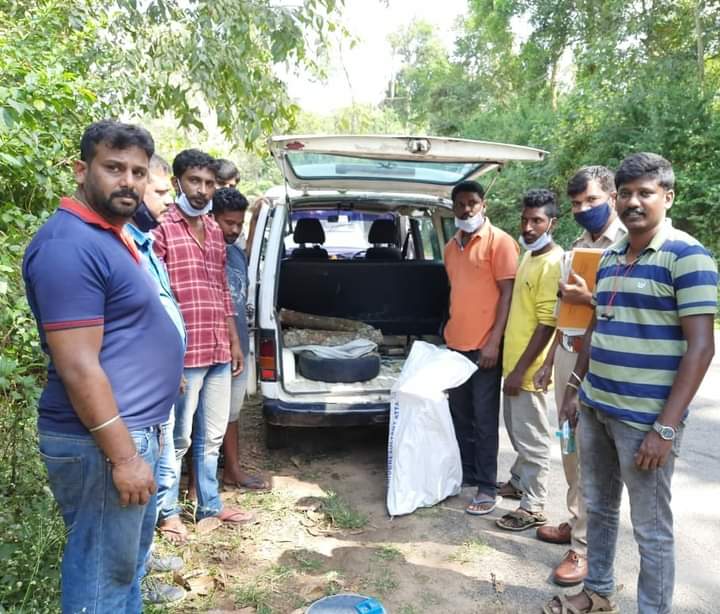 ಶುಕ್ರವಾರವಿರಾಜಪೇಟೆ ಗ್ರಾಮಾಂತರ ಠಾಣೆ ಎಎಸ್ಐ ಶ್ರೀಧರ್ ಮತ್ತು ಸಿಬ್ಬಂದಿಯವರು ಗಸ್ತು ಕರ್ತವ್ಯದಲ್ಲಿರುವಾಗ ವಿರಾಜಪೇಟೆ ತಾಲ್ಲೂಕು ಅಮ್ಮತ್ತಿ ಗ್ರಾಮದ ಬಳಿ ಅನುಮಾನಾಸ್ಪದವಾಗಿ ನಿಂತಿದ್ದ ಕೆಎ-12-ಎಂ-0044 ನೋಂದಣಿ ಸಂಖ್ಯೆಯ ಕಾರನ್ನು ತಪಾಸಣೆ ಮಾಡಿದಾಗ ಶ್ರೀಗಂಧ ಮರದ ತುಂಡುಗಳು ಕಂಡುಬಂದಿದ್ದು ಆರೋಪಿಗಳಾದ ಸುಜಯ್, ಅರ್ಜುನ್, ಮುತ್ತಪ್ಪ ಮತ್ತು ಮಹದೇವಸ್ವಾಮಿ ಎಂಬುವವರನ್ನು ವಶಕ್ಕೆ ಪಡೆದು ವಿಚಾರಣೆ ಮಾಡಿ ಕಿಶನ್ ಎಂಬುವವರ ಕಾಫಿ ತೋಟದಿಂದ ಕಳವು ಮಾಡಿದ್ದ 35 ಸಾವಿರ ಮೌಲ್ಯದ ಶ್ರೀಗಂಧ ಮರದ ತುಂಡುಗಳು ಹಾಗೂ ಕೃತ್ಯಕ್ಕೆ ಉಪಯೋಗಿಸಿದ ವಾಹನ ವಶಕ್ಕೆ ಪಡೆದು ಪ್ರಕರಣ ದಾಖಲಿಸಿ ತನಿಖೆ ಕೈಗೊಂಡಿದ್ದಾರೆ. ಆರೋಪಿಗಳನ್ನು ನ್ಯಾಯಾಂಗ ಬಂಧನಕ್ಕೆ ಒಳಪಡಿಸಲಾಗಿದೆ.