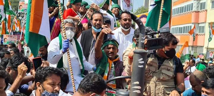 ಬೆಳಗ್ಗೆ ಮೆಜೆಸ್ಟಿಕ್ನಿಂದ ಆರಂಭವಾದ ಕಾಂಗ್ರೆಸ್ ರ್ಯಾಲಿ ರಾಜಭವನದತ್ತ ಹೊರಟಿದ್ದು ರಾಜಭವನ ಮುತ್ತಿಗೆ ಹಾಕಲು ಹೊರಟ ಪ್ರತಿಪಕ್ಷ ನಾಯಕ ಸಿದ್ದರಾಮಯ್ಯ, ಕೆಪಿಸಿಸಿ ಅಧ್ಯಕ್ಷ ಡಿ.ಕೆ ಶಿವಕುಮಾರ್, ಮಾಜಿ ಡಿಸಿಎಂ ಜಿ. ಪರಮೇಶ್ವರ್, ಮಾಜಿ ಸಚಿವ ರಾಮಲಿಂಗಾರೆಡ್ಡಿ ಸೇರಿದಂತೆ ಕಾಂಗ್ರೆಸ್ ಕಾರ್ಯಕರ್ತರನ್ನು ಮಹಾರಾಣಿ ಕಾಲೇಜ್ ಬಳಿ ಪೊಲೀಸರು ವಶಕ್ಕೆ ಪಡೆದಿದ್ದು ಅವರನ್ನೆಲ್ಲಾ ಬಿಎಂಟಿಸಿ ಬಸ್ ನಲ್ಲಿ ಕರೆದುಕೊಂಡು ಹೋಗಲಾಯಿತು.