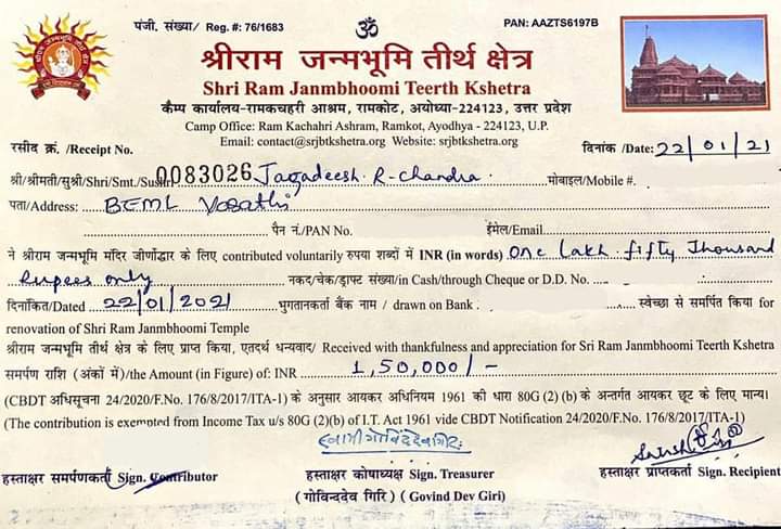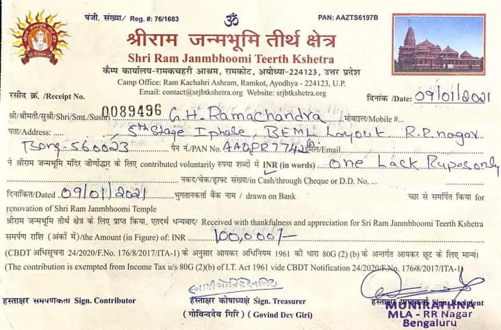 ಬೆಂಗಳೂರು: ಅಯೋಧ್ಯಾ ಶ್ರೀ ರಾಮಮಂದಿರ ನಿರ್ಮಾಣಕ್ಕೆ ದೇಣಿಗೆ ಸಂಗ್ರಹ ಮಾಡಲು ಚಾಲನೆ ನೀಡಲಾಗಿದ್ದು ಸಾಮಾನ್ಯರು ಹಾಗೂ ಸೆಲೆಬ್ರಿಟಿಗಳು ನಿರ್ಮಾಣಕ್ಕೆ ದೇಣಿಗೆ ನೀಡುತ್ತಿದ್ದಾರೆ.