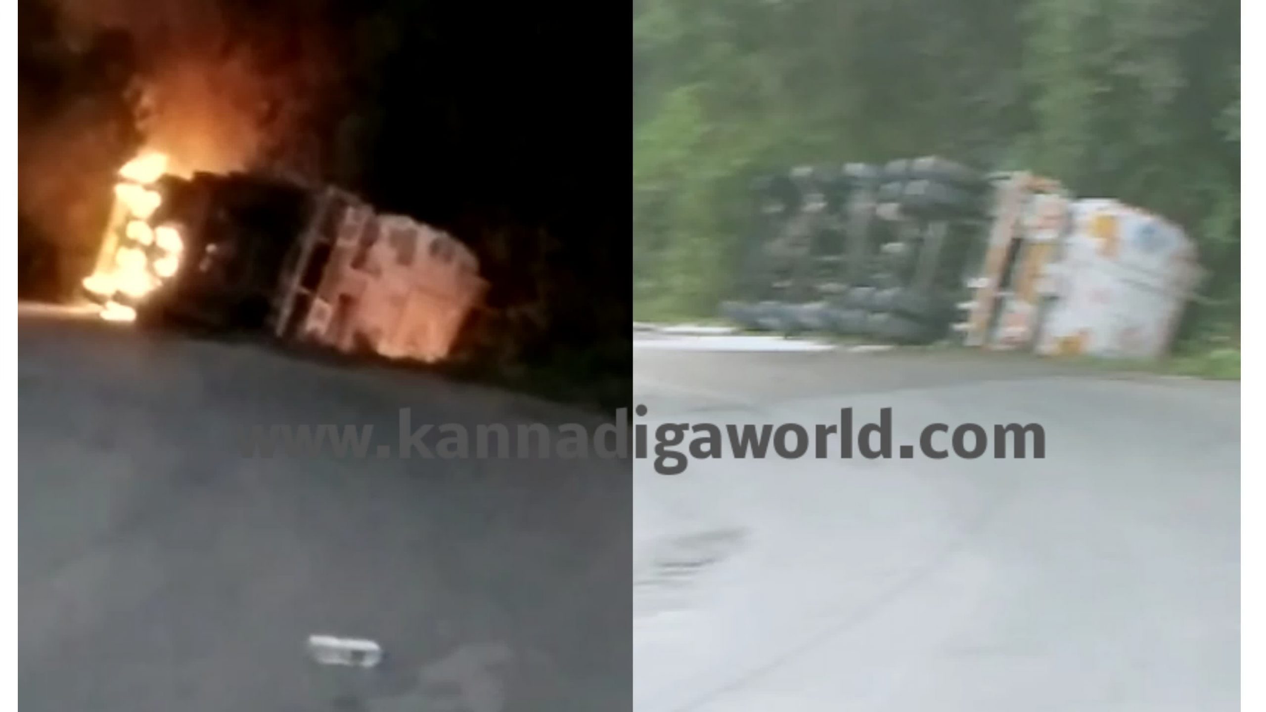 ಕಾರವಾರ: ರಾಸಾಯನಿಕ ತುಂಬಿದ ಟ್ಯಾಂಕರ್ ಕಾರಾವಾರ ತಾಲ್ಲೂಕಿನ ಆರತಿಬೈಲ್ ಘಟ್ಟದ ತಿರುವಿನಲ್ಲಿ ಬುಧವಾರ ಮಗುಚಿ ಬಿದ್ದಿದೆ. ಇದರಿಂದ ಸೋರಿದ ಕೆಮಿಕಲ್ ಹಳ್ಳದಲ್ಲಿ ಹರಿದು ಬೆಂಕಿ ಹತ್ತಿಕೊಂಡು ರೈತರ ತೋಟ ಗದ್ದೆಗಳಿಗೆ ಹಾನಿಯಾಗಿದೆ.